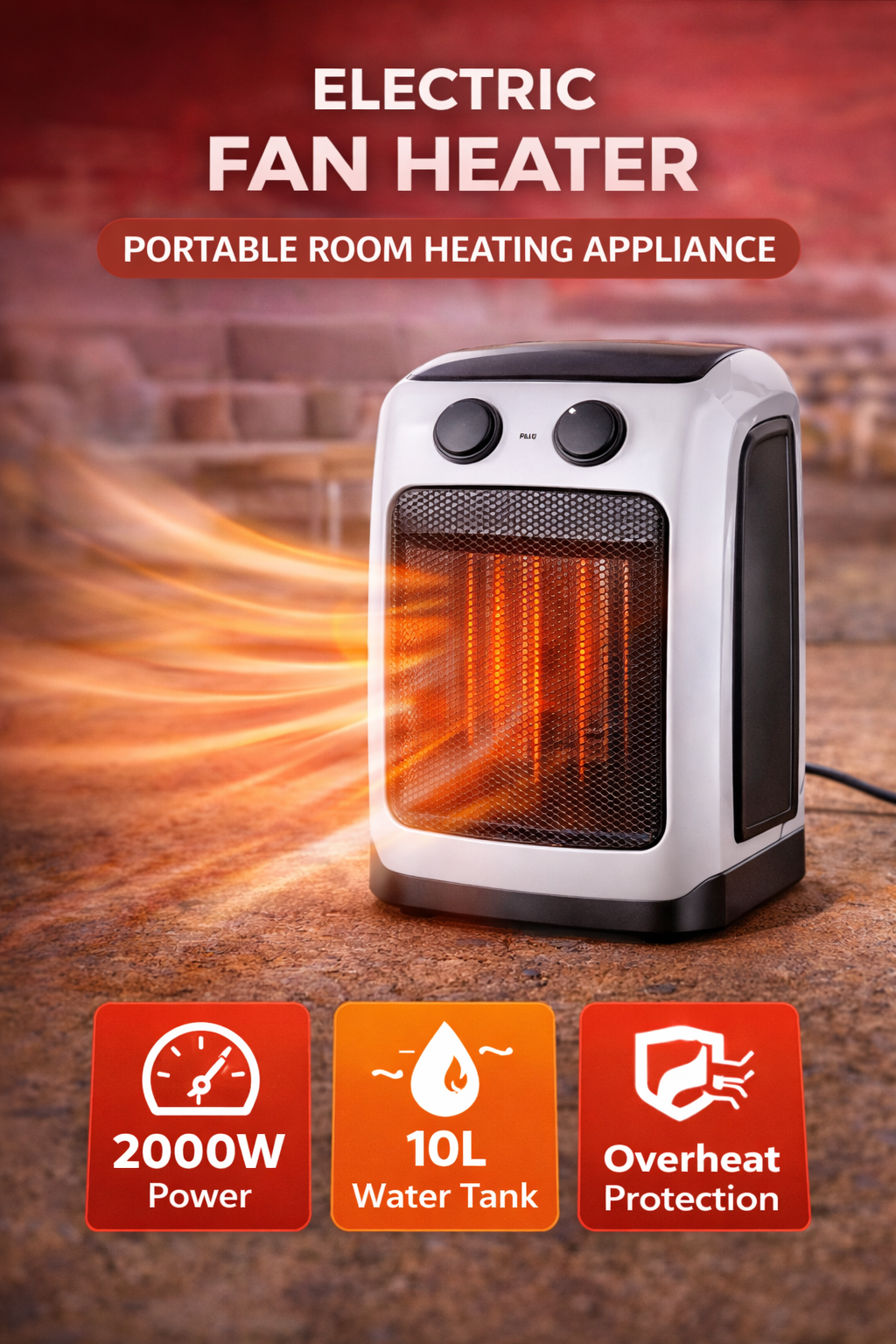 Compact electric fan heater designed to quickly warm small rooms, offices, and workshops.